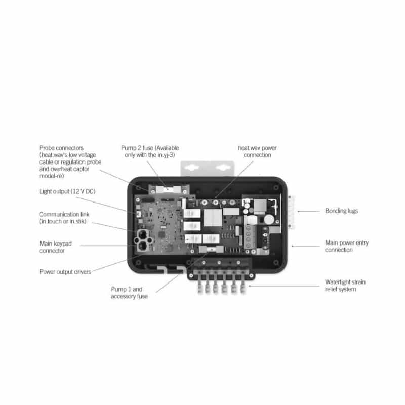 Its well known that the best-selling in.yj-V3 is the nicest control system for small footprint spas. But the temptation to muscle it up and make it the best there is proved irresistible. With its boosted CPU, more memory and higher capacity relays, in.yj-V3 now has the power it needs for new features like an updated FLO circuit, LED lights for troubleshooting clues and dual phase CE configuration so it can be used anywhere in the world.